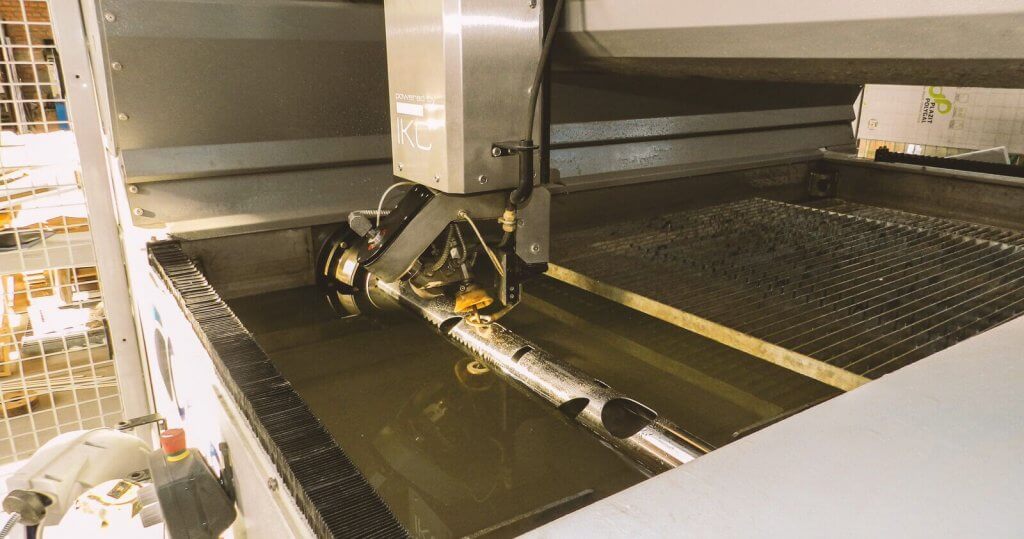 Наявність шостої осі координат надає нам можливість проводити фрезерні операції на трубі, тільки замість стандартного фрезерного інструменту використовується гідрорізна технологія. Габарити труби, яку можливо обробляти на нашому обладнанні можуть сягати 3600 мм в довжину і діаметром до 350 мм. Дана технологія обробки труб має дуже широке застосування: з допомогою гідрорізу можна отримати трубу зі складними отворами, які можуть служити як декоративними (наприклад світильники з труб), так і технологічними (коли необхідно отримати точний отвір для з’єднання, наприклад, з іншою трубою).